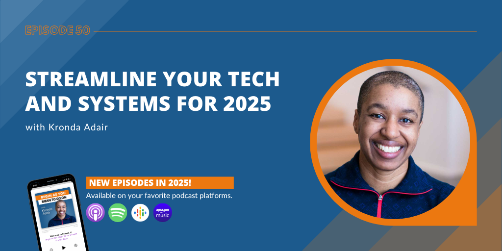 Begin as you mean to go on Streamline Your Tech and Systems for 2025Subscribe Listen onApple Podcast Listen onGoogle Podcasts Listen onSpotify Listen onAmazon Podcast Kronda Adair,CEO, KArvel digital After a 2.5 year hiatus Begin as You Mean to Go On is back! Here’s what we’re up to and how we’re helping mission-driven service-based business